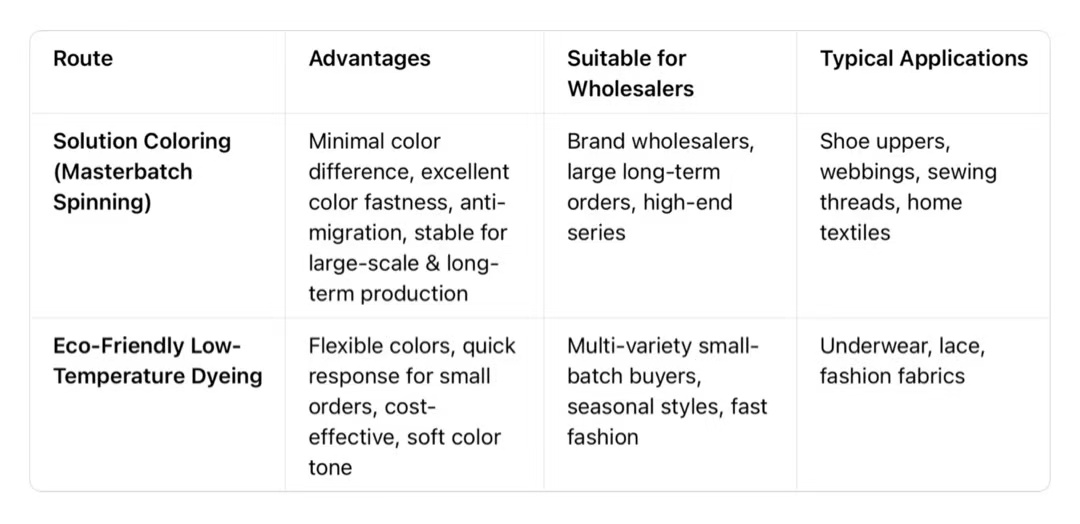 Targeting the characteristics of low-melting-point nylon, a dual-path approach is adopted: solution dyeing and high-temperature environmentally friendly dyeing.